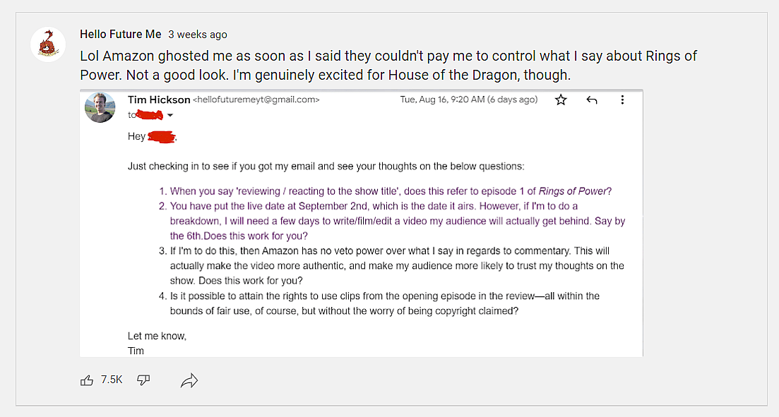 Hello Future Me notes that after sending this email, Prime Video ghosted him, “Lol Amazon ghosted me as soon as I said they couldn’t pay me to control what I say about Rings of Power. Not a good look. I’m genuinely excited for House of the Dragon, though.”
