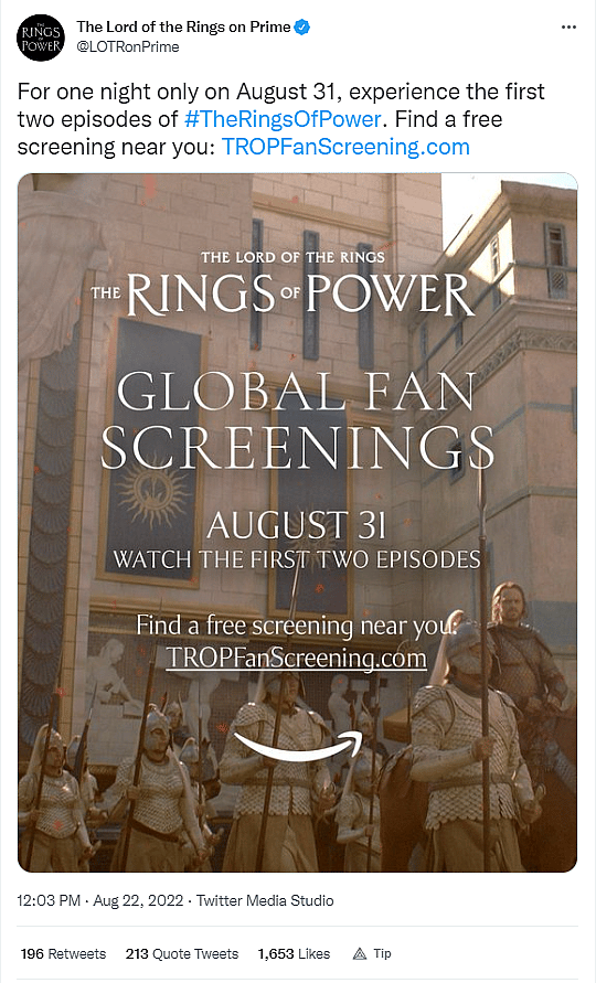 The official The Lord of the Rings on Prime Twitter account announced the theatrical screenings writing, “For one night only on August 31, experience the first two episodes of The Rings of Power.”