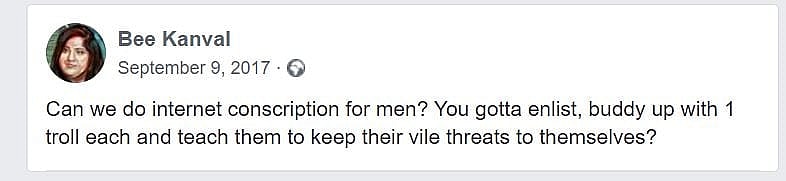 In a Facebook post, she asked, “Can we do internet conscription for men? You gotta enlist, buddy up with 1 troll each and teach them to keep their vile threats to themselves?”