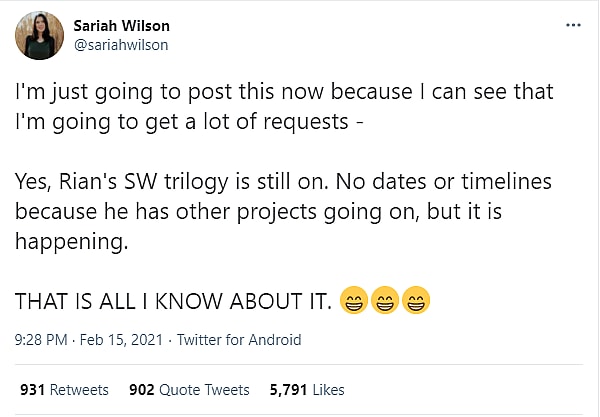 At the time she wrote, “I’m just going to post this now because I can see that I’m going to get a lot of requests – Yes, Rian’s SW trilogy is still on. No dates or timelines because he has other projects going on, but it is happening. THAT IS ALL I KNOW ABOUT IT.”