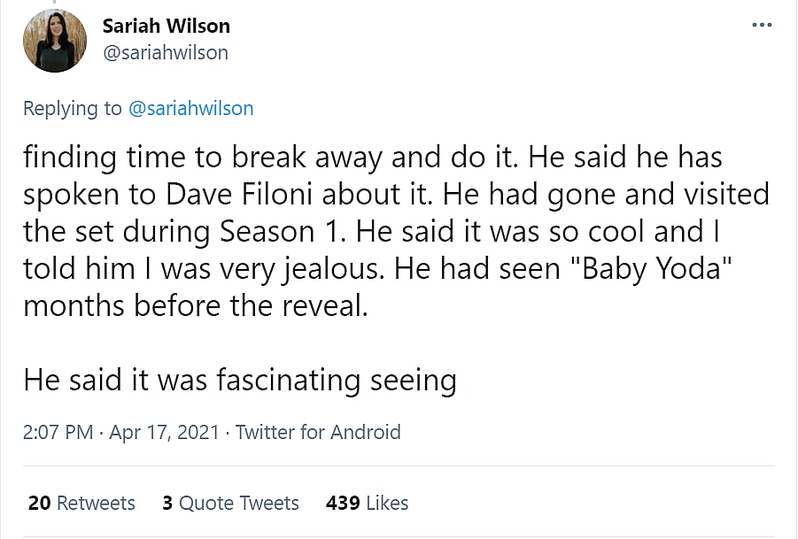 In a subsequent tweet she added, “He said he has spoken to Dave Filoni about it. He had gone and visited the set during Season 1. He said it was so cool and I told him I was very jealous. He had seen ‘Baby Yoda’ months before the reveal.”