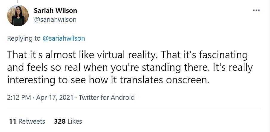 Wilson concluded, “That it’s almost like virtual reality. That it’s fascinating and feels so real when you’re standing there. It’s really interesting to see how it translates onscreen.”