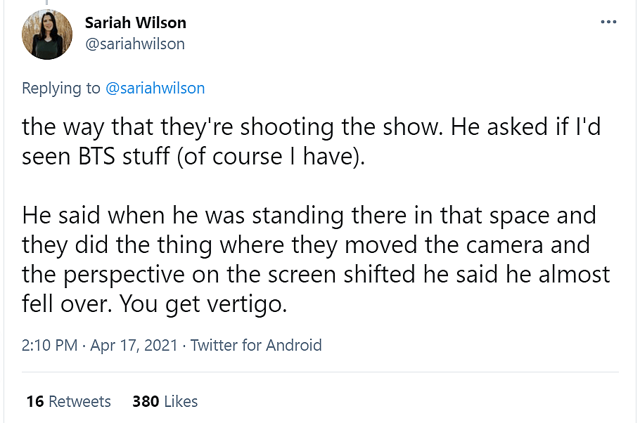 She continued, “He said it was fascinating seeing the way that they’re shooting the show. He asked if I’d seen BTS stuff (of course I have). He said when he was standing there in that space and they did the thing where they moved the camera and the perspective on the screen shifted he said he almost fell over. You get vertigo.”