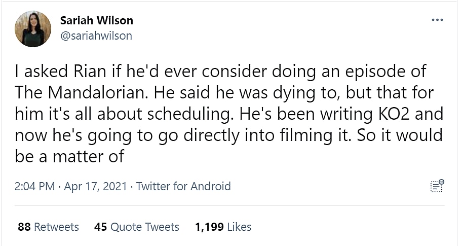 Wilson wrote, “I asked Rian if he’d ever consider doing an episode of The Mandalorian. He Said he was dying to, but that for him it’s all about scheduling.”