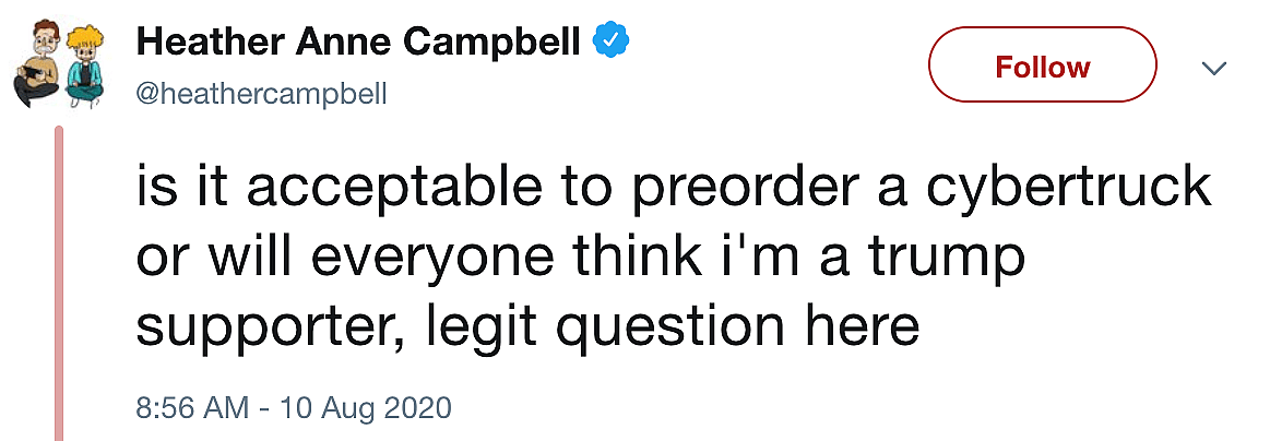 “Is it acceptable to preorder a cybertruck or will everyone think i’m a trump supporter, legit question here,” asked the woke writer on Twitter back in August of 2020.