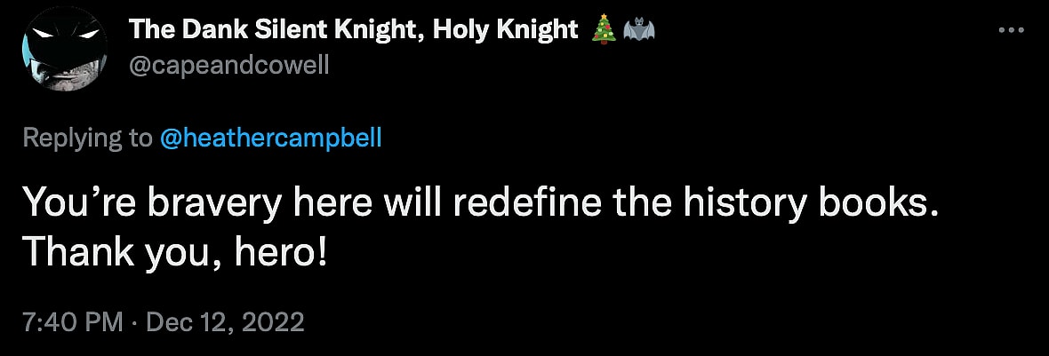 @capeandcowell sarcastically wrote, “[Your] bravery here will redefine the history books. Thank you, hero.”