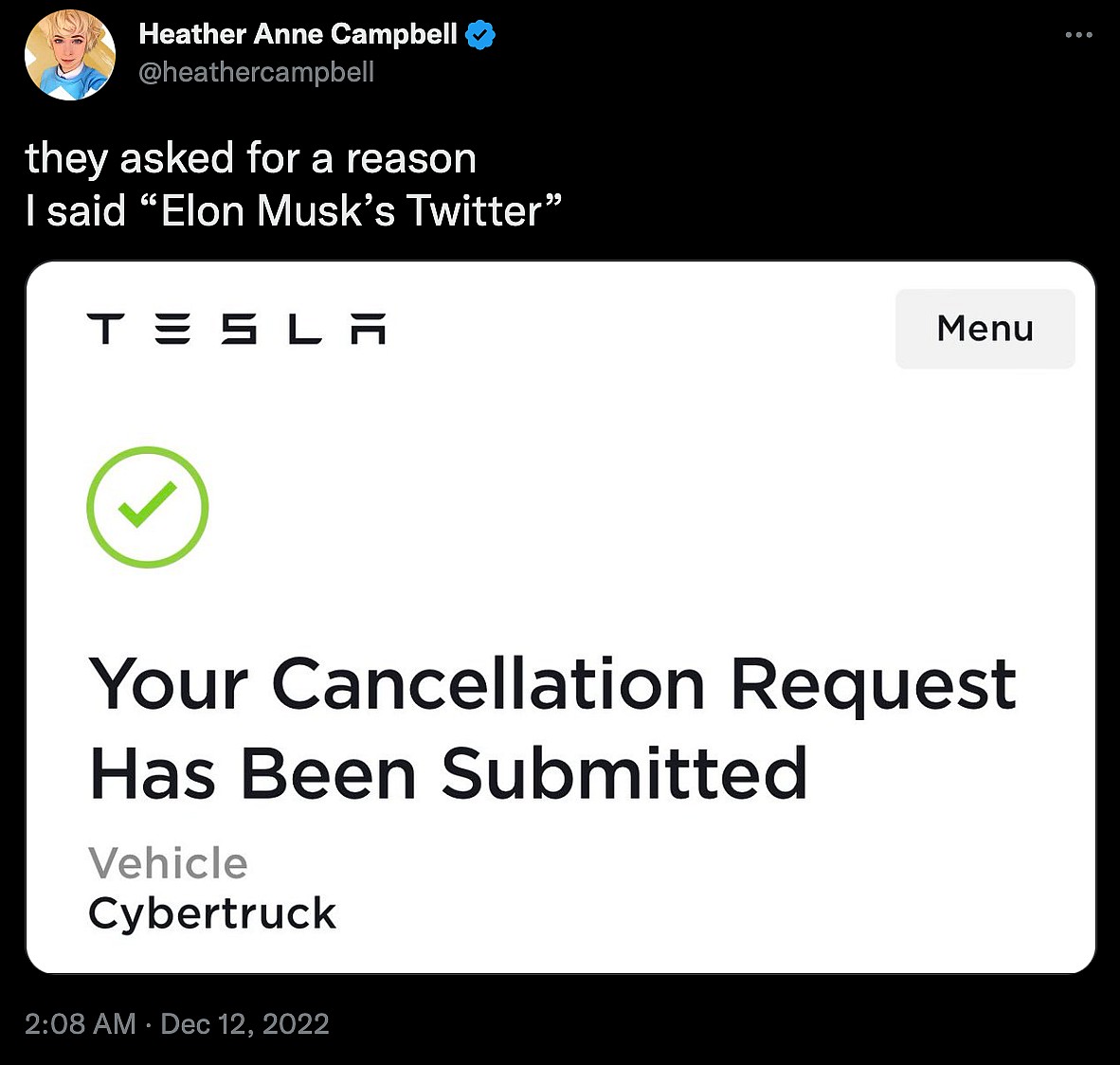 ‘Rick And Morty’ Writer Heather Anne Campbell Virtue Signals Against Elon Musk’s Twitter Acquisition By Cancelling Her Tesla Cybertruck Order