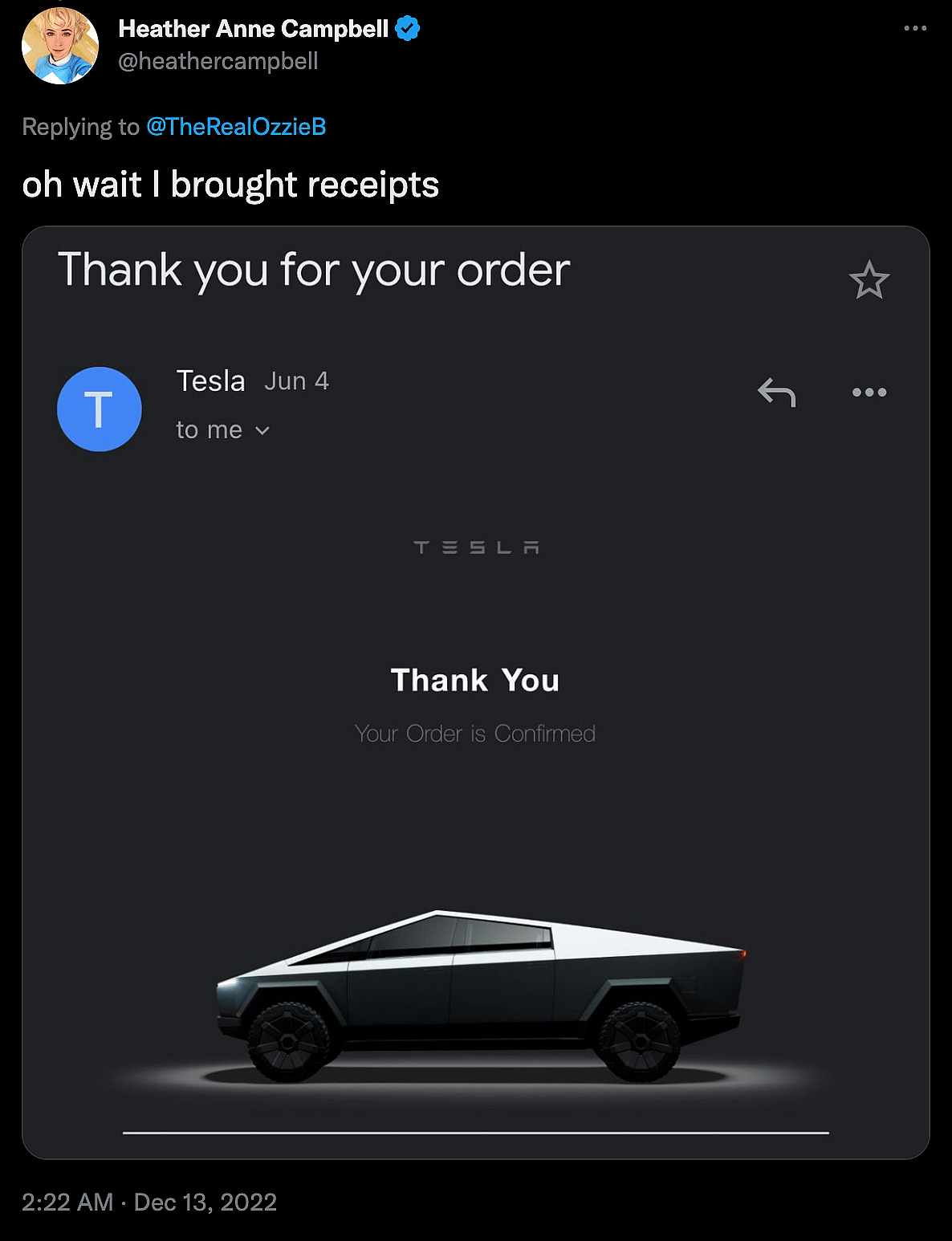 As proof that she not only placed an order but it did it before publishing her initial tweet, Campbell shared a screenshot of an email from Tesla customer support confirming that she had made her reservation in June of this year (Gmail only lists a date’s year if it is not the current calendar year).