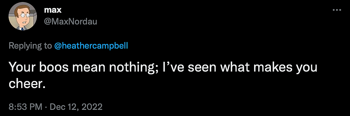 “Your boos mean nithing; I’ve seen what makes you cheer,” read a witty remark made by @MaxNordau, who used a line from the very show Campbell works on to call out her woke and shameless bleating.