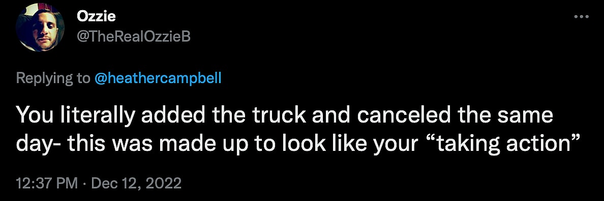 Putting these doubts into words, @TheRealOzzieB replied to Campbell, “You literally added the truck and canceled the same day- this was made up to look lik you’re ‘taking action'”.