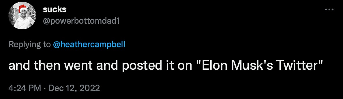 “And then went and posted it on ‘Elon Musk’s Twitter'” likewise pointed out @powerbottomdad1.