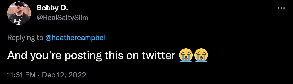“And you’re posting this on Twitter,” noted @RealSaltySlim, including two crying emojis to add insult to injury.