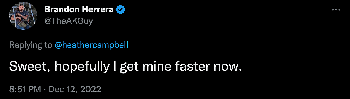 Brandon Herrera, known on YouTube as ‘The AK Guy’, also celebrated the fact that Campbell had cancelled her order, gleefully declaring, “Sweet, hopefully I get mine faster now.”