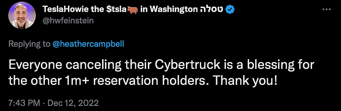 Offering his thanks to Campbell and those who reacted just as hysterically as she had, @hwfeinstein praised, “Everyone canceling their Cybertruck is a blessing for the other 1m+ reservation holders. Thank you!”