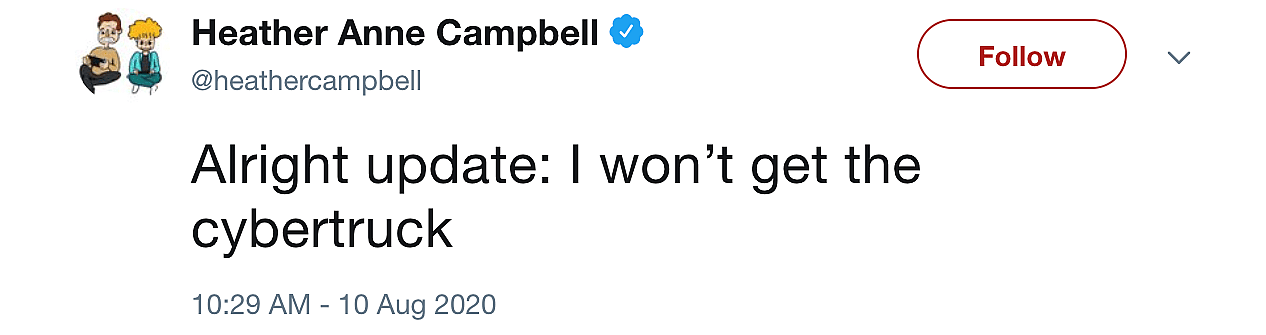 A bit over an hour later, Campbell asserted, “Alright update: I won’t get the cybertruck”.