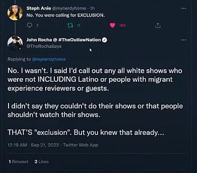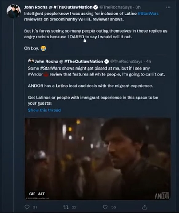 When he was called out for trying to exclude white people from reviewing Andor, Rocha replied, “No. I wasn’t. I said I’d call out any all white shows who were not INCLUDING Latino or people with migrant experience reviewers or guests.”