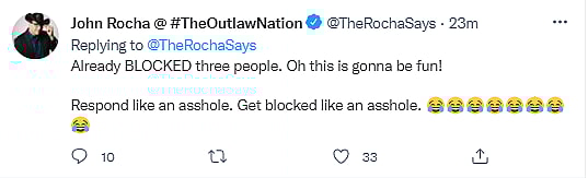 In a subsequent tweet he wrote, “Already BLOCKED three people. Oh this is gonna be fun! Respond like an a**hole. Get blocked like an a**hole.”
