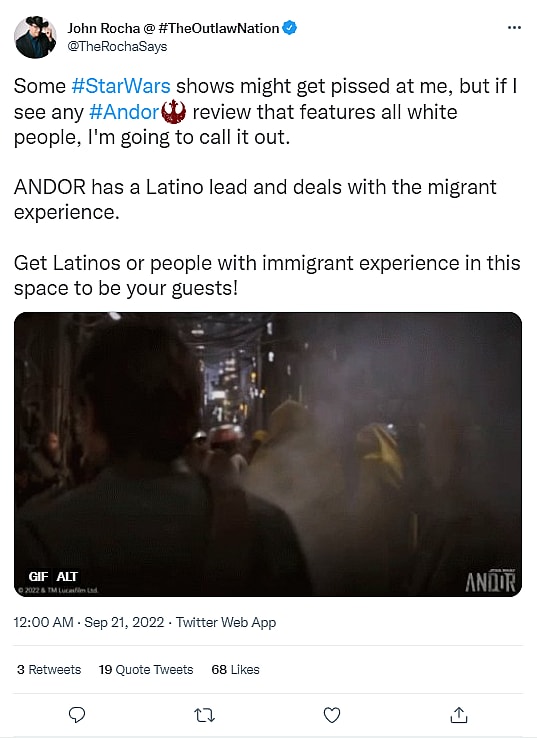 On September 20th, Rocha took to his Twitter account where he wrote, “Some Star Wars shows might get pissed at me, but if I see any Andor review that features all white people, I’m going to call it out.”