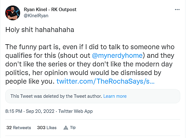 YouTuber Ryan Kinel rebuked Rocha writing, “The funny part is, even if I did to talk to someone who qualifies for this (shout out MyNerdyHome) and they don’t like the series or they don’t like the modern day politics, her opinion would would be dismissed by people like you.”