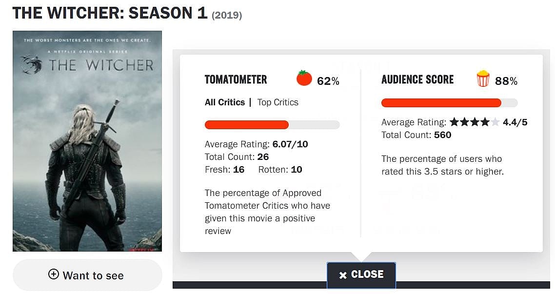 Dan Fienberg at The Hollywood Reporter gives the show a Rotten review. He writes, “Will you like The Witcher if you’re a curious neophyte? Maybe, but you have to be patient with it, and if that’s not your job, the outsized amusements may not be worth the convoluted build-up.”