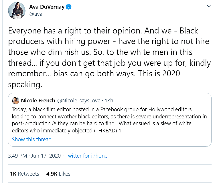 In reply to a lengthy Twitter thread from Nicole French attempting to shame Hollywood editors who objected to an editor explicitly seeking out black union editors, DuVernay tweeted, “Everyone has a right to their opinion. And we – Black producers with hiring power – have the right to not hire those who diminish us. So, to the white men in this thread… if you don’t get that job you were up for, kindly remember… bias can go both ways. This is 2020 speaking.”
