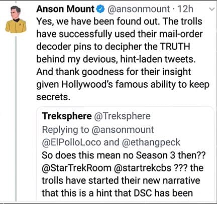 Mount would follow up that Tweet with a now-deleted one responding to a fan who questioned whether Star Trek: Discovery would see a Season 3.