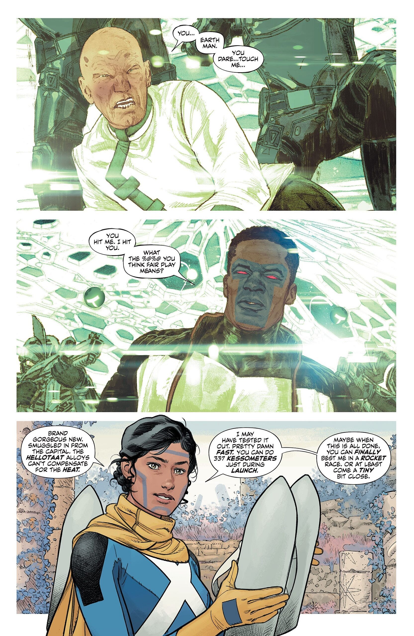 It continues, “But not all is as happy and nice as it seems, as the decisions Adam made during battles on Rann come back to haunt his family and threaten the entire DC Universe.” In the story, Adam Strange follows bad intel that led to the war, and Mr. Terrific looks suspect in the public’s eyes for investigating a decorated hero.