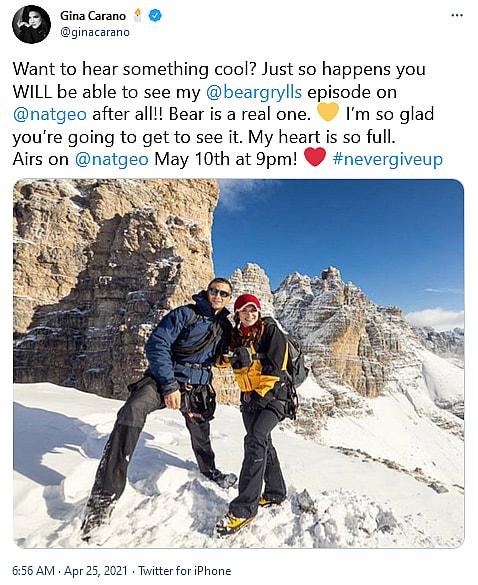 She wrote, “Want to hear something cool? Just so happens you WILL be able to see my Bear Grylls episode on National Geographic after all! Bear is a real one. I’m so glad you’re going to get to see it. My heart is so full. Airs on National Geographic May 10th and 9 pm! #nevergiveup.”