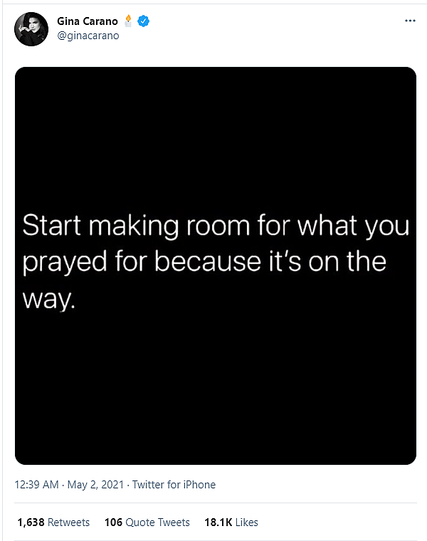 There might be another piece of evidence as well. Carano also recently tweeted an image that reads, “Start making room for what you prayed for because it’s on the way.”