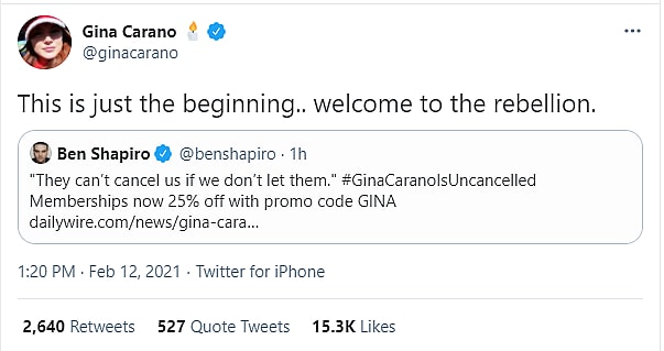 As for Carano being offended by Disney, she made that clear when she joined Ben Shapiro on his show in February after Disney fired her.