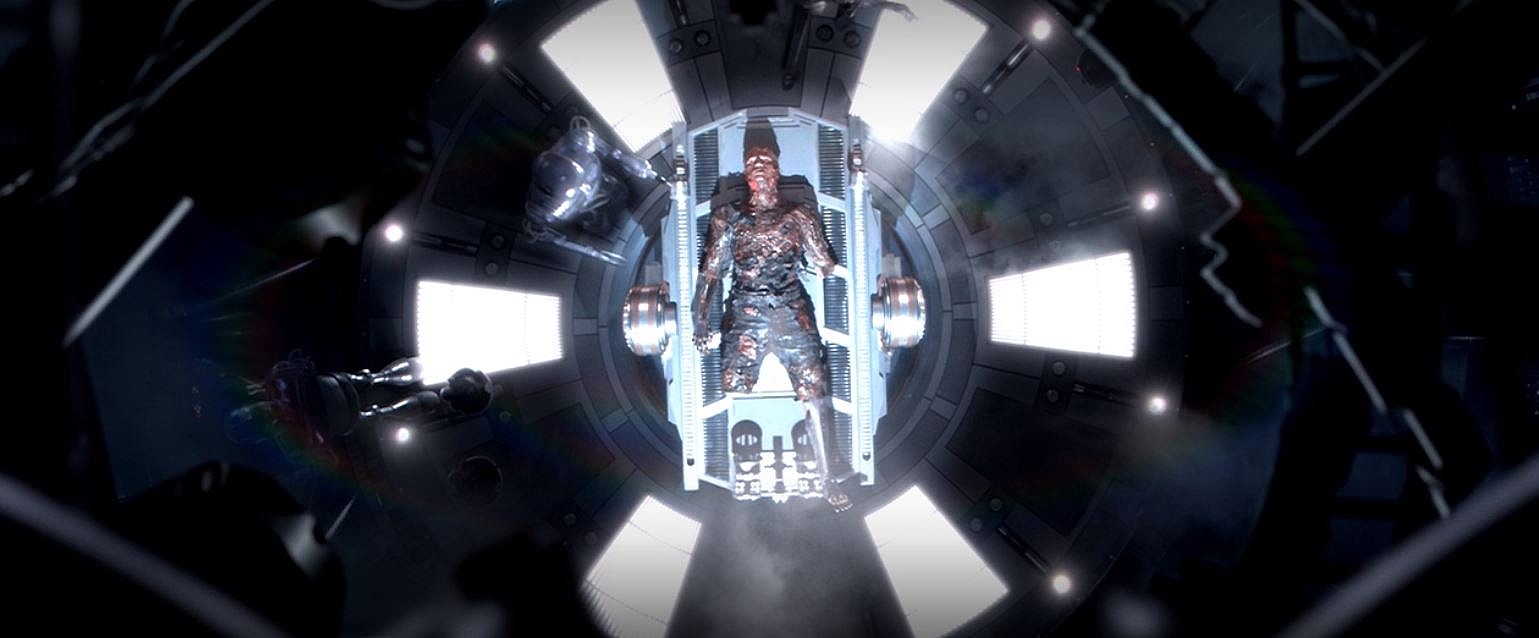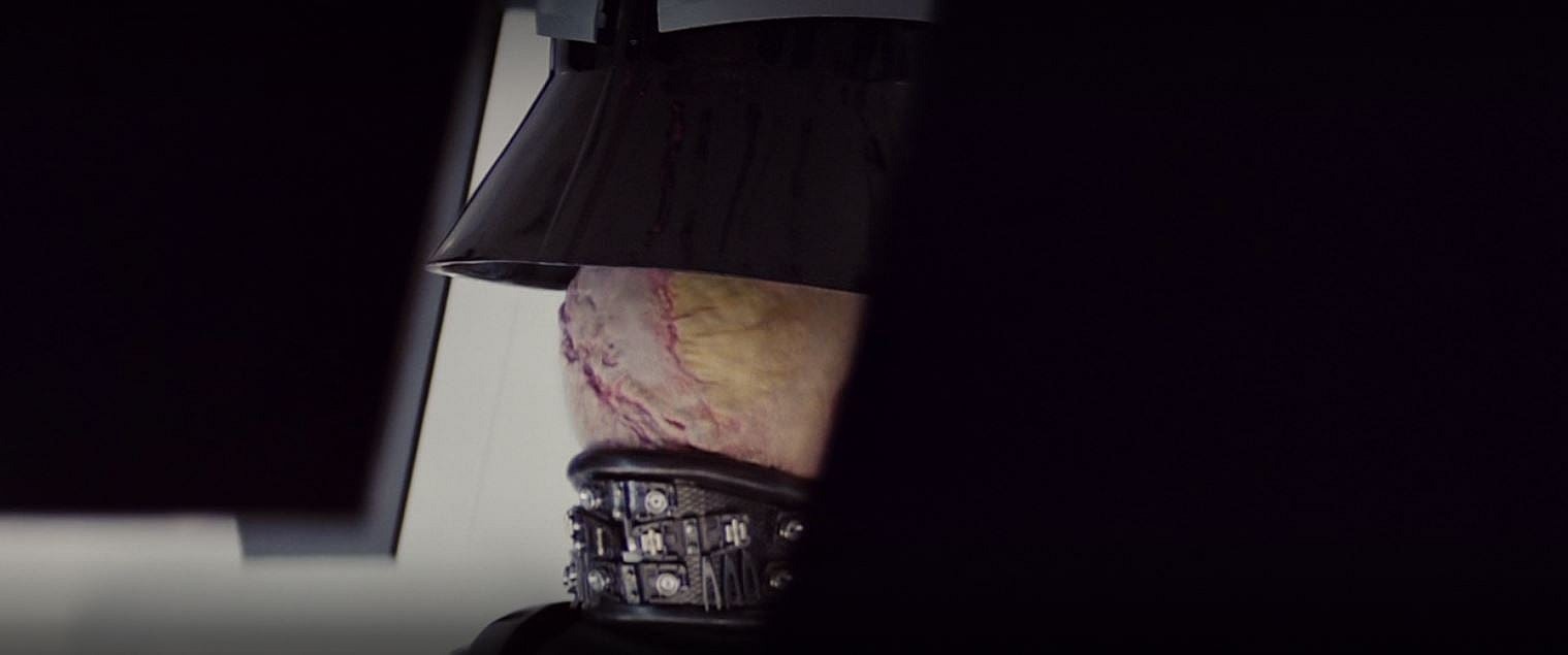 Without his helmet on Vader is “conscious of the stumps of his legs, the ruin of his arms, the perpetual pain in his flesh.”