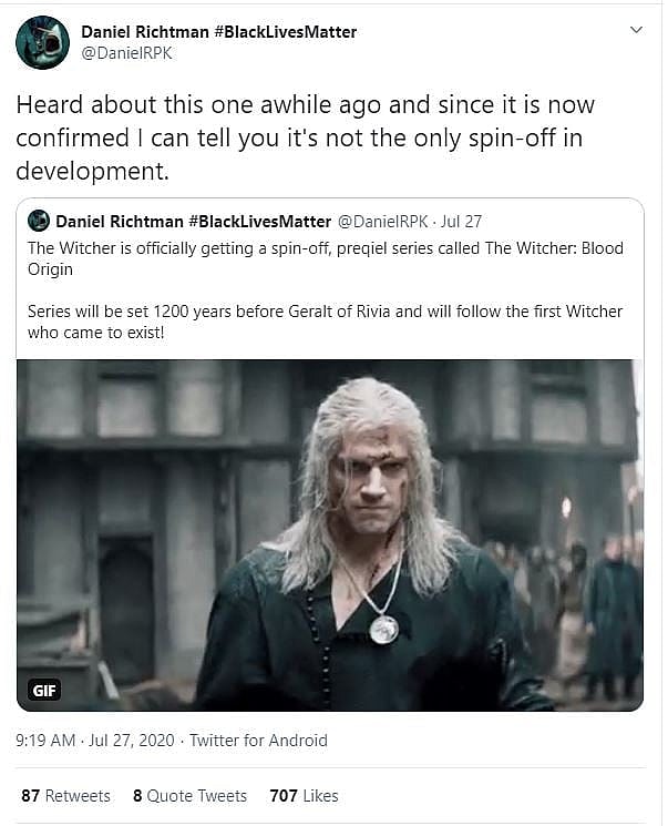 In response to the announcement about the officially announced live-action prequel series The Witcher: Blood Origin, Richtman tweeted, “Heard about this one awhile ago and since it is now confirmed I can tell you it’s not the only spin-off in development.”