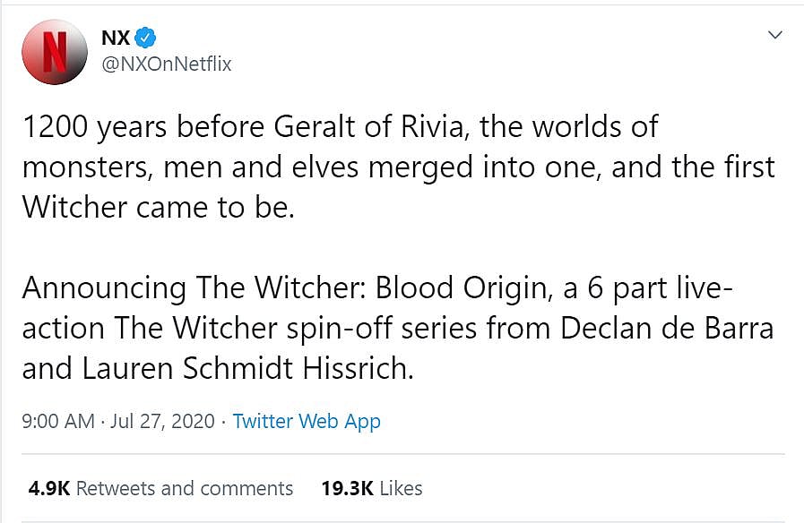 The second confirmed project is the six-part live-action series The Witcher: Blood Origin.