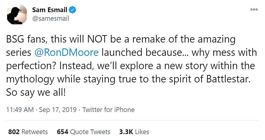 Esmail then added, “Instead, we’ll explore a new story within the mythology while staying true to the spirit of Battlestar. So say we all!”
