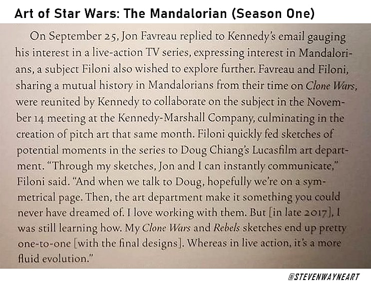 “Favreau and Filoni sharing a mutual history in Mandalorians from their time on Clone Wars, were reunited by Kennedy to collaborate on the subject in the November 14 meeting at the Kennedy-Marshall Company, culminating in the creation of pitch art that same month,” it continues.
