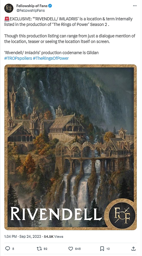 This latest rumor comes from Fellowship of Fans on X who state, “‘RIVENDELL/ IMLADRIS’ is a location & term internally listed in the production of ‘The Rings of Power’ Season 2.”
