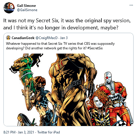 This sentiment was shared by Secret Six writer Gail Simone, the writer behind the team’s revival in the mid-2000s as part of the Infinite Crisis crossover, who stated on Twitter earlier this month that she believed the series to be “no longer in development, maybe?”