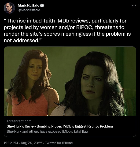 The piece was later shared to Twitter by She-Hulk actor Mark Ruffalo, who in doing so highlighted Hinton’s assertion that “The rise in bad-faith IMDb reviews, particularly for projects led by women and/or BIPOC, threatens to render the site’s scores meaningless if the problem is not addressed.”