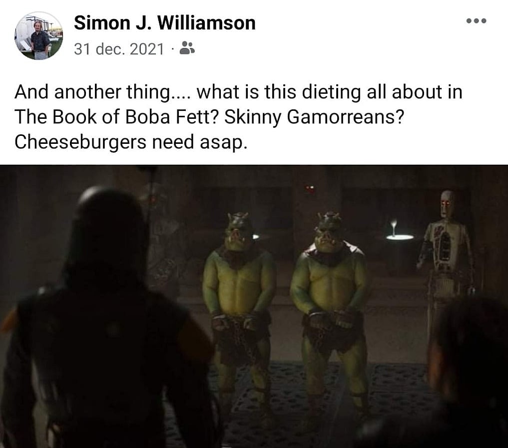He wrote on Facebook, “And another thing… what is this dieting all about in The Book of Boba Fett? Skinny Gamorreans? Cheeseburgers need asap.”