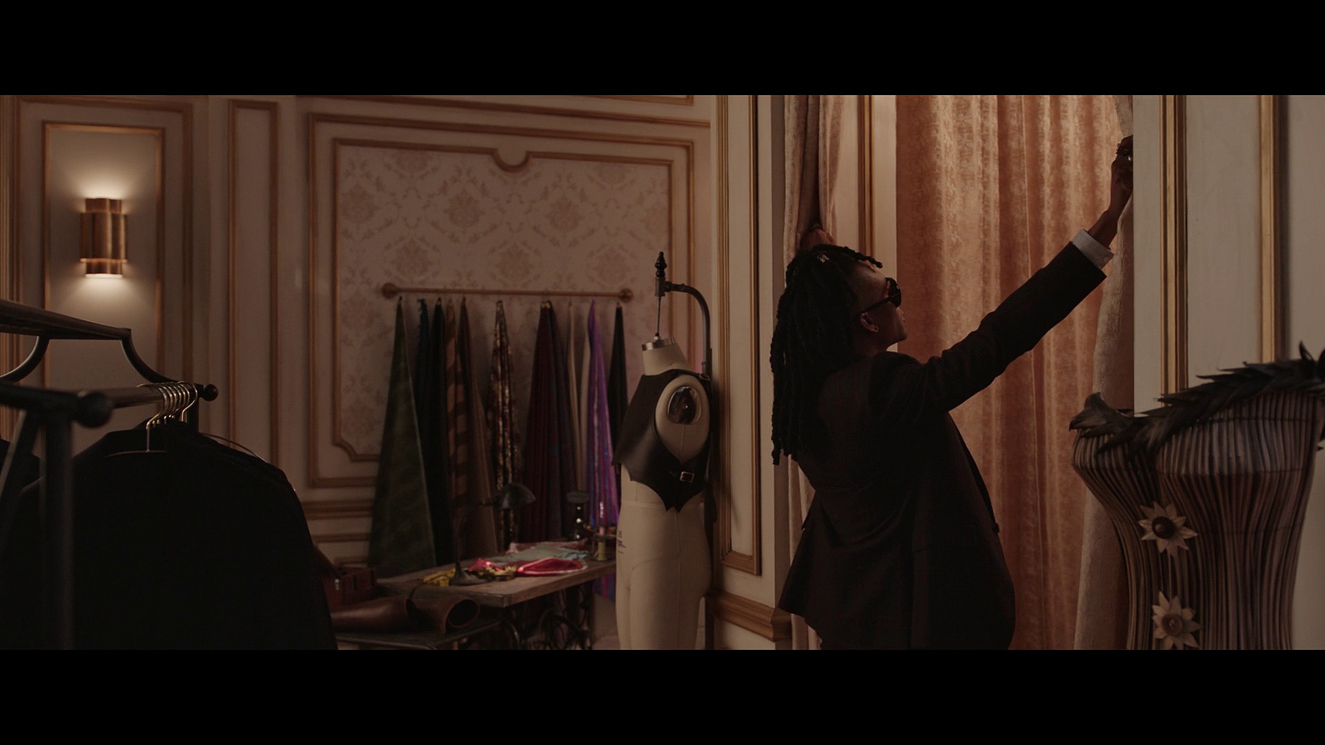 Upon her arrival to Luke’s studio for her appointment to try on her new clothes, the designer leads Jen to a changing room, helping her inside before handing her a suit from off the rack next to him.