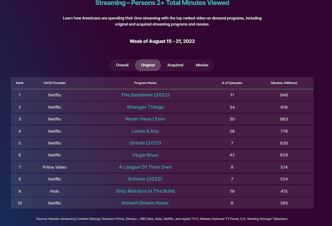 As noted below, She-Hulk’s viewership was below 395 million minutes, which was 10th place Instant Dream Home’s viewership minutes.