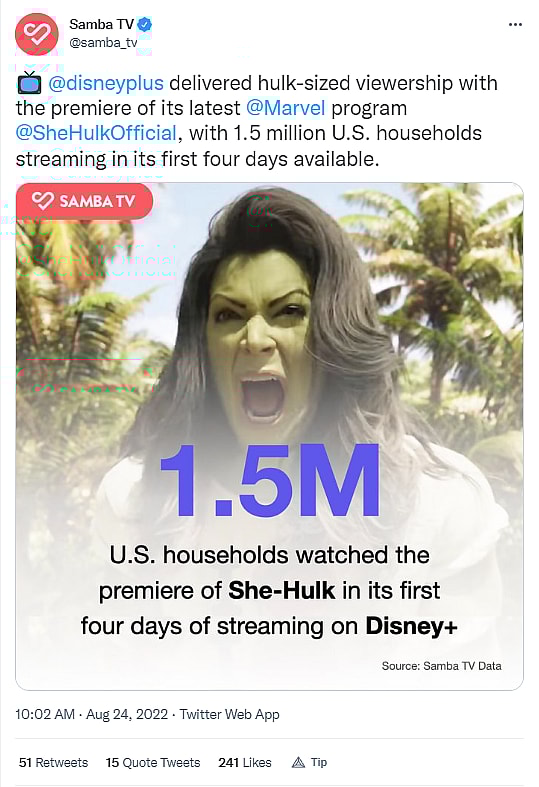 Samba TV reported She-Hulk was watched by 1.5 million U.S. households streaming in its first four days available on Disney+.