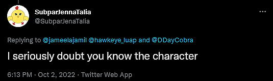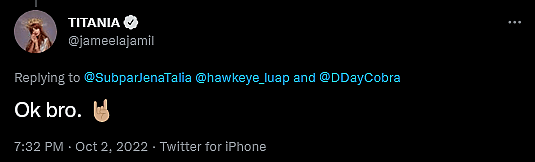 Then met with an accusation of “I seriously doubt you know the character” by @SubparJenaTalia, Jamil simply wrote “Ok bro,” alongside an emoji representing the two-horned hand gesture for ‘rock on’.