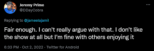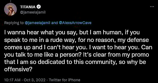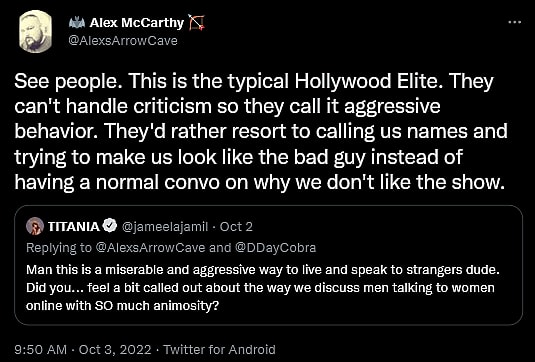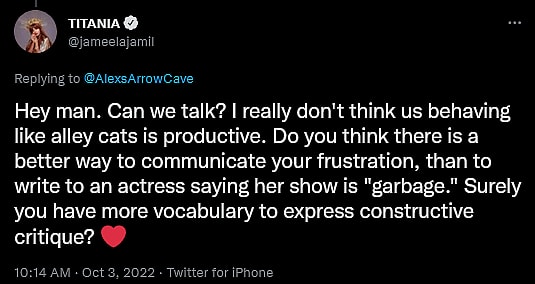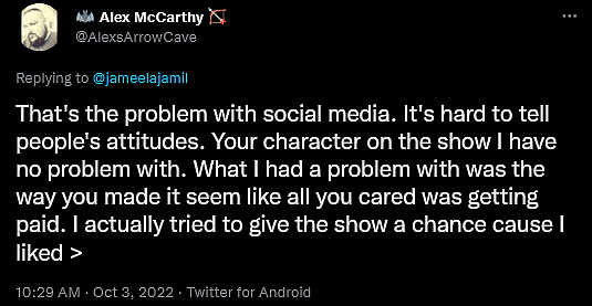 In an admittedly admirable display of her commitment to this humanity, Jamil reached out once again to the aforementioned @AlexsArrowCave, who had since responded to her question by detailing, “See people. This is the typical Hollywood Elite. They can’t handle criticism so they call it aggressive behavior. They’d rather resort to calling us names and trying to make us look like the bad guy instead of having a normal convo on why we don’t like the show.”