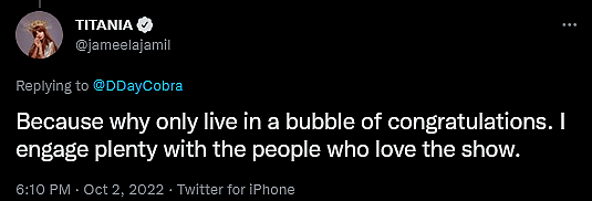 “Because why only live in a bubble of congratulations,” posited Jamil. “I engage plenty with the people who love the show.”