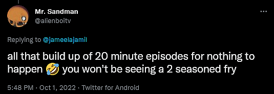 “all that build up of 20 minute episodes for nothing to happen,” mocked the user. “you won’t be seeing a 2 seasoned fry”.