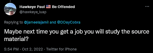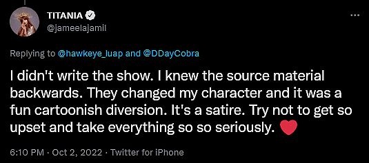 “Maybe next time you get a job you will study the source material?” asked @hawkeye_luap, to which Jamil explained, “I didn’t write the show.”
