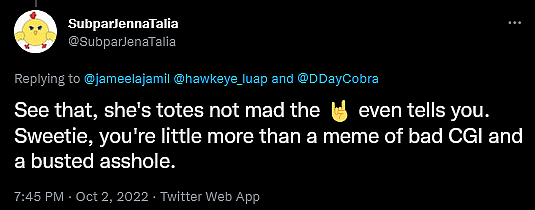“See that, she’s totes not mad the [emoji] even tells you,” said @SubparJenaTalia. “Sweetie, you’re little more than a meme of bad CGI and a busted a–hole.”