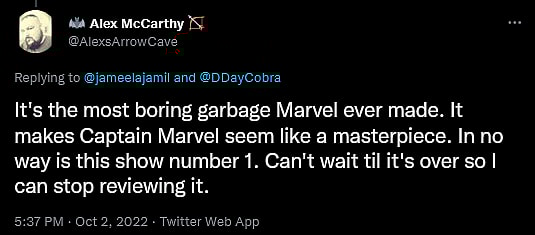 Making a separate criticism, @AlexsArrowCave opined to Jamil, “It’s the most boring garbage Marvel ever made. It makes Captain Marvel seem like a masterpiece. In no way is this show number 1. Can’t wait til it’s over so I can stop reviewing it.”