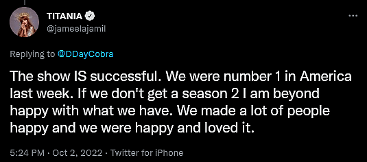 “The show IS successful,” the actress exclaimed in turn. “We were number 1 in America last week. If we don’t get a season 2 I am beyond happy with what we have. We made a lot of people happy and we were happy and loved it.”
